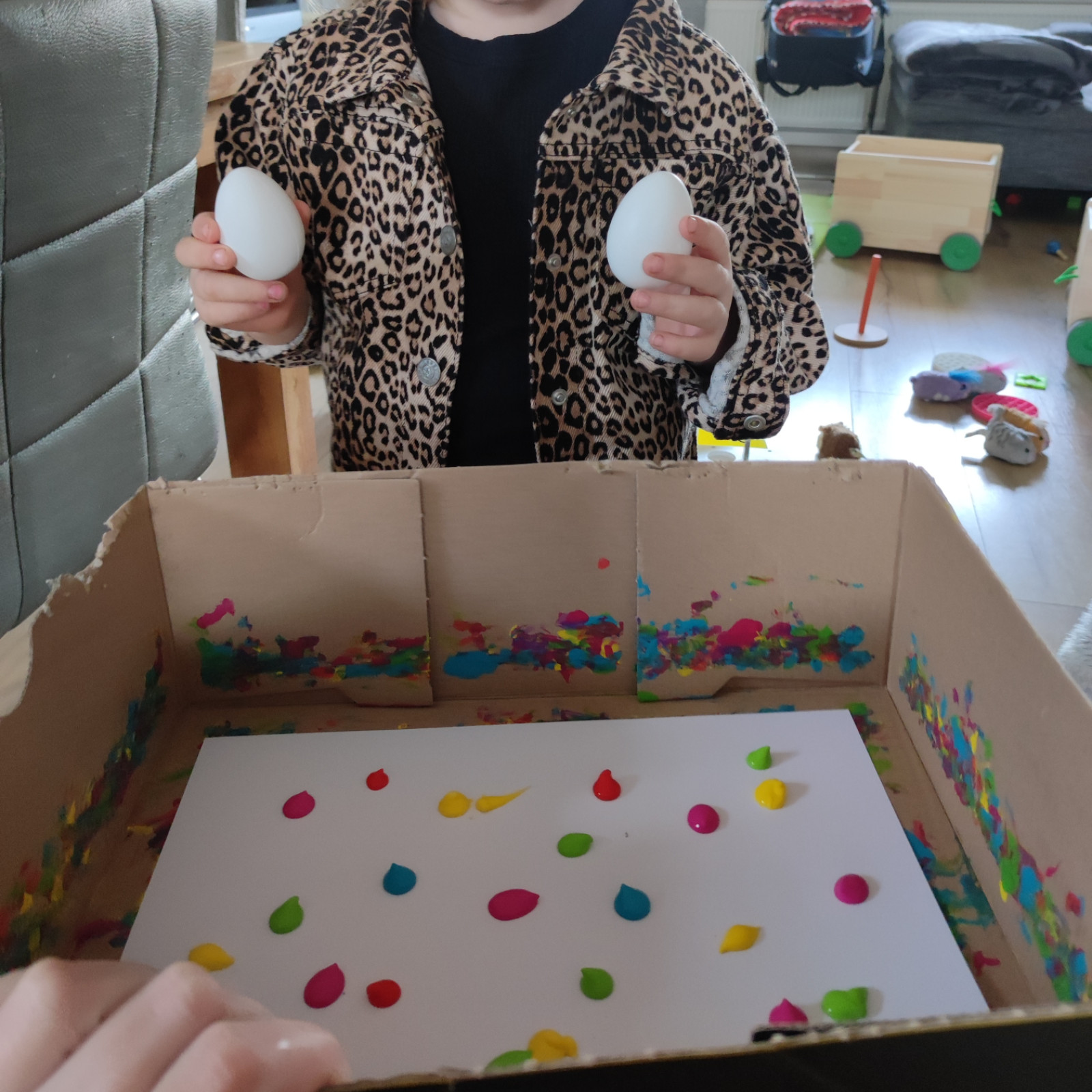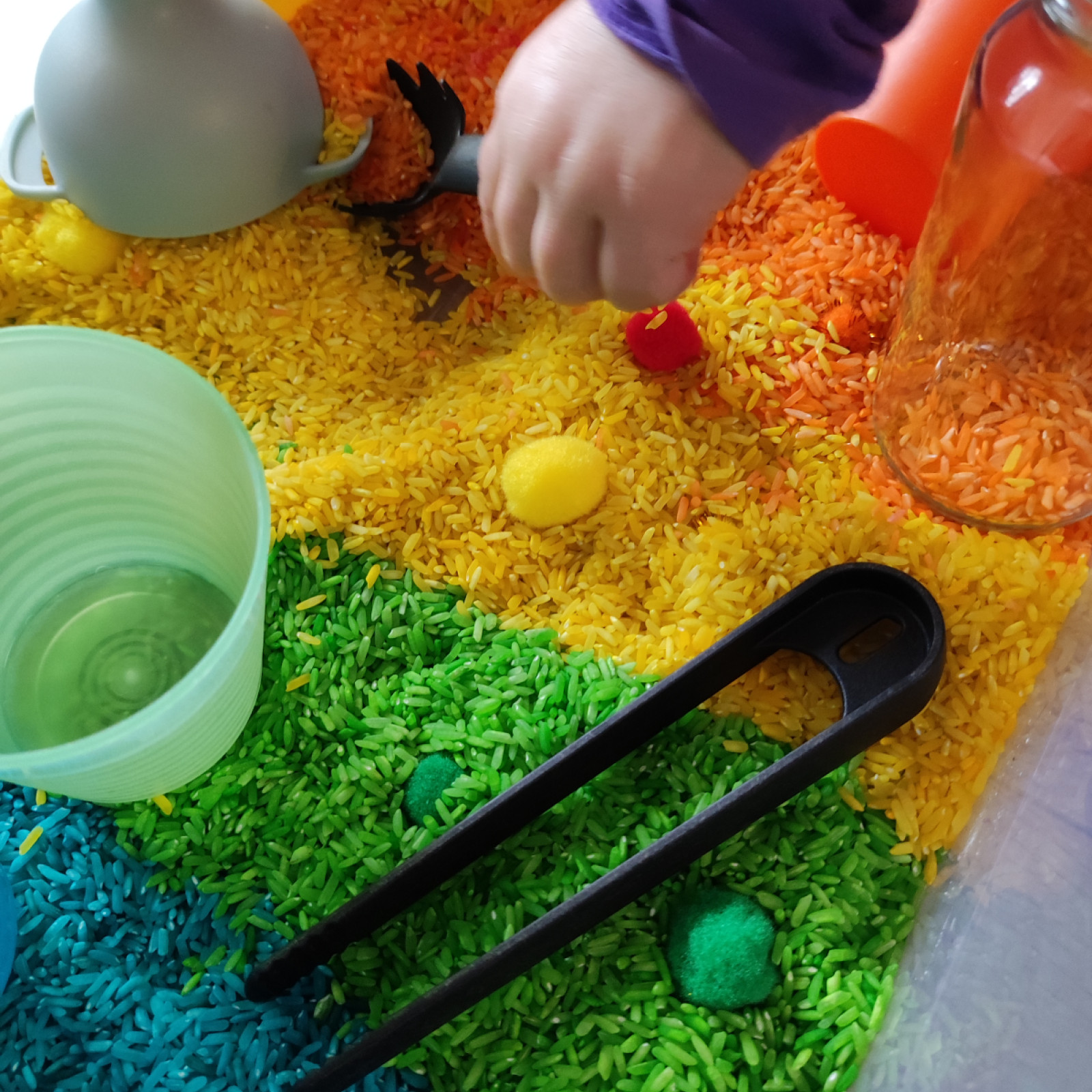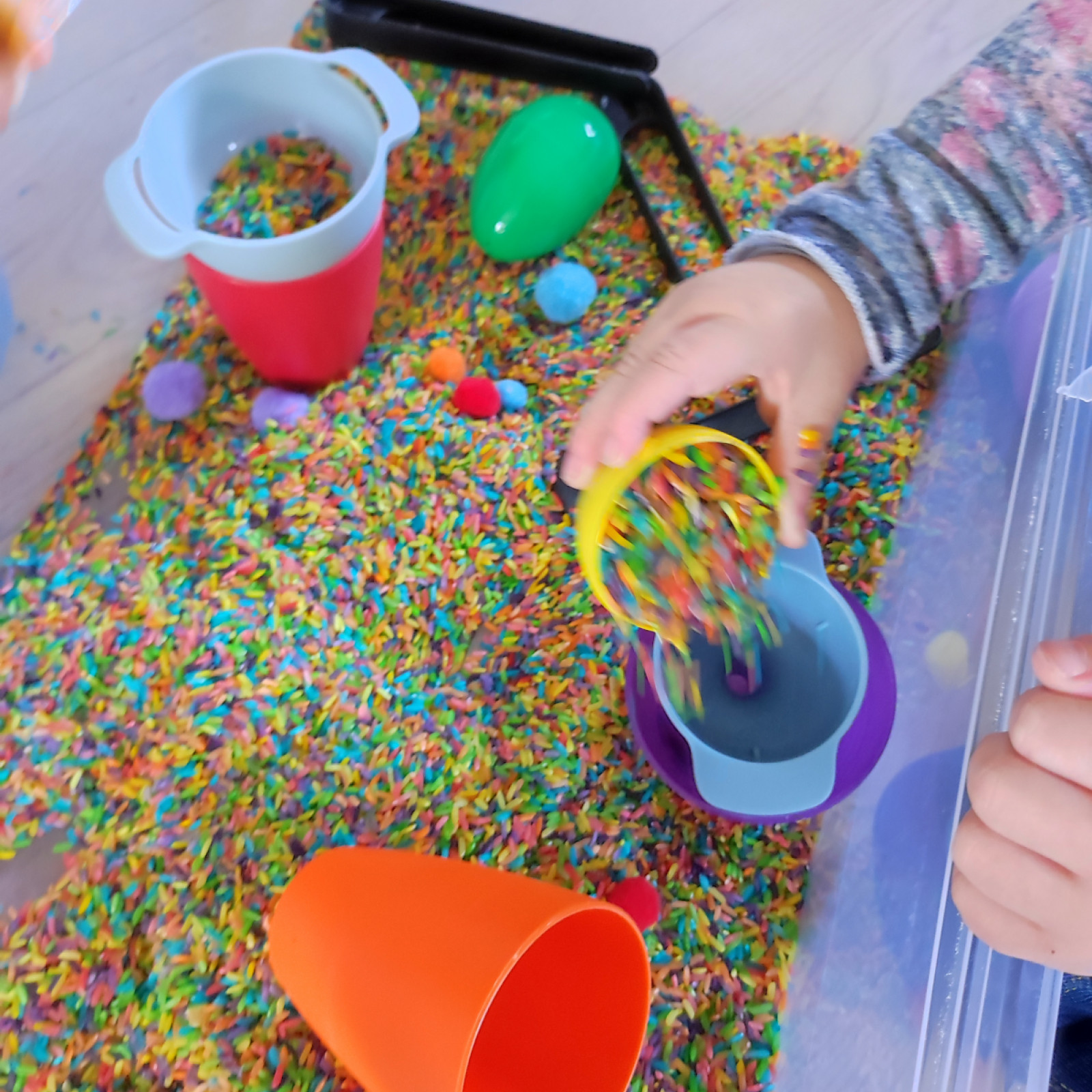 Die Kinder durften viel mit den sensory bin spielen. Der ist so beliebt. Ich hatte noch immer den gefärbten Reis drin und habe da dann ein paar Plastik Eier mit rein getan.