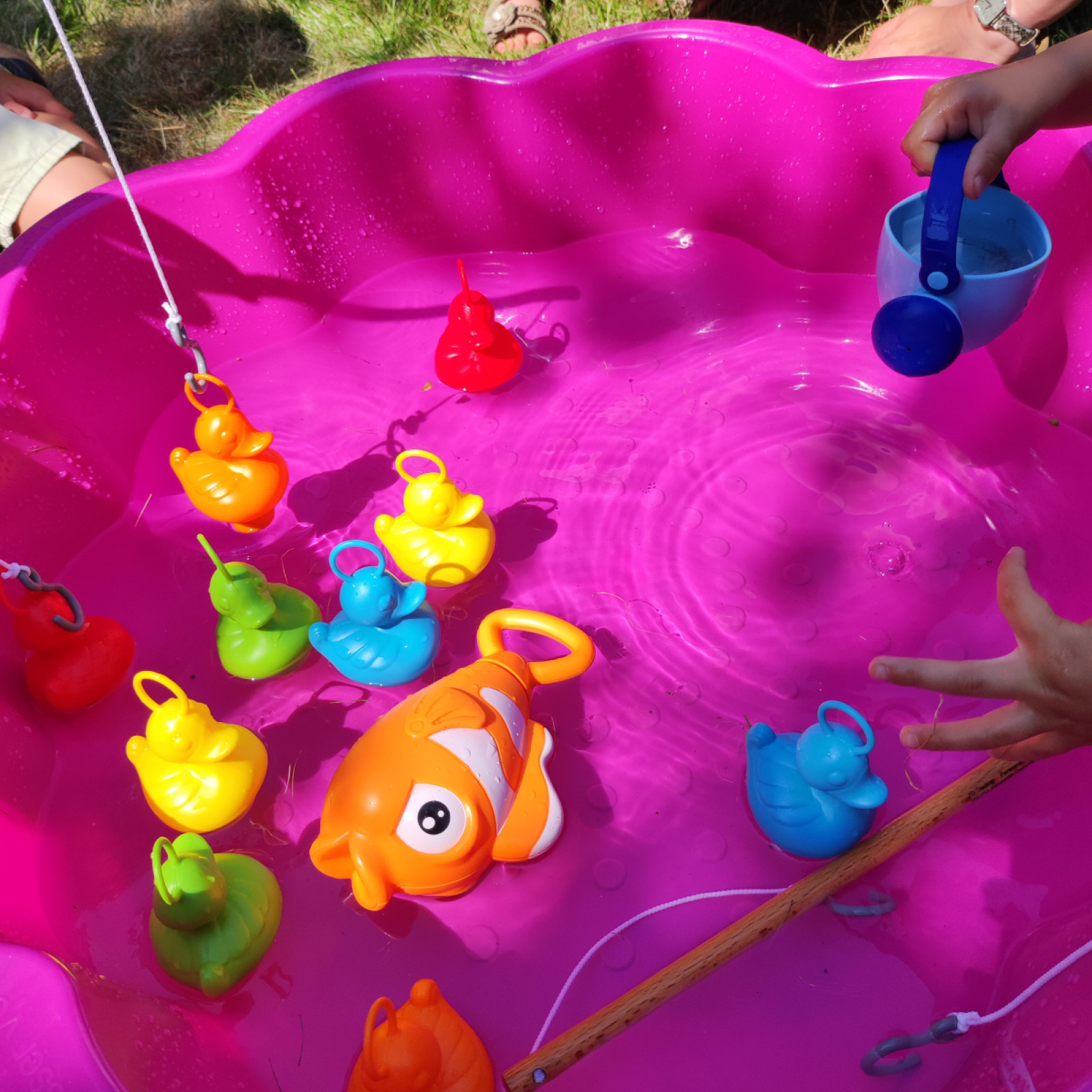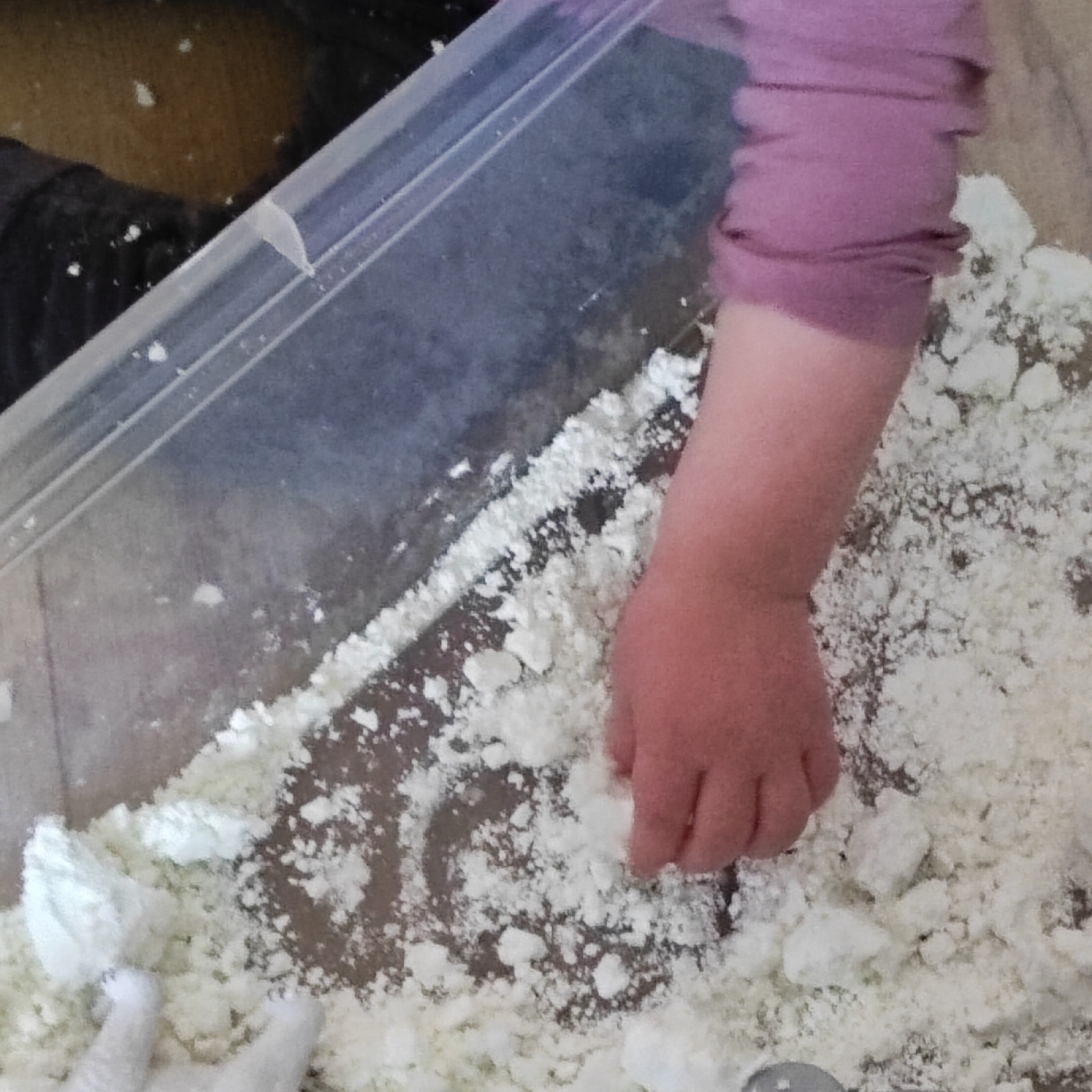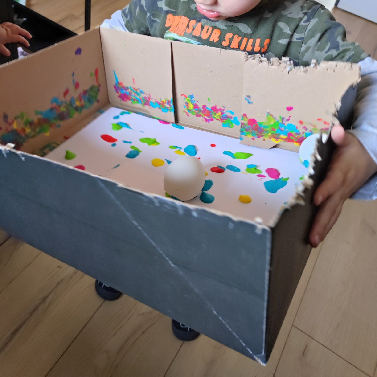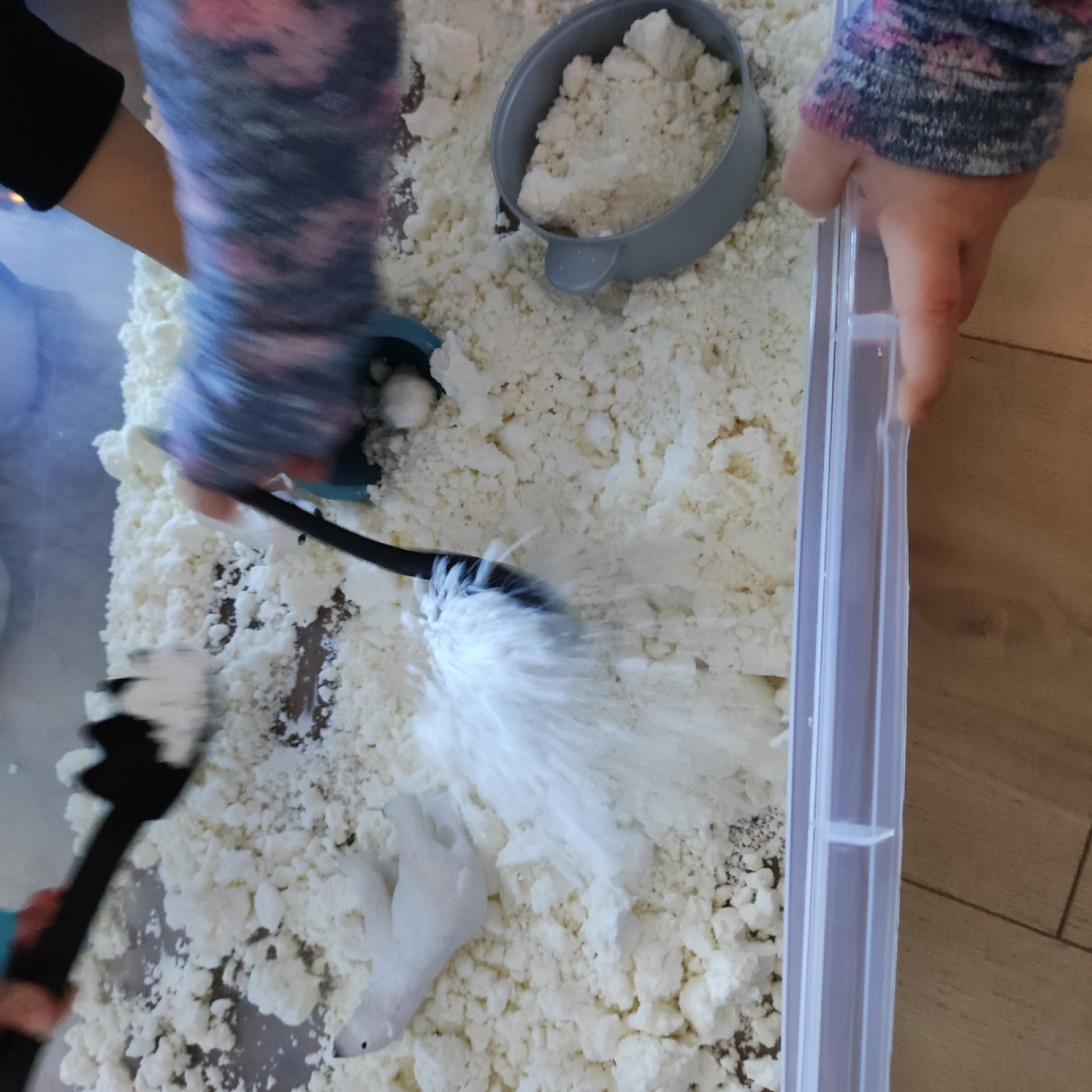 Die Kinder durften viel mit den sensory bin spielen. Der ist so beliebt. Ich hatte noch immer den gefärbten Reis drin und habe da dann ein paar Plastik Eier mit rein getan.