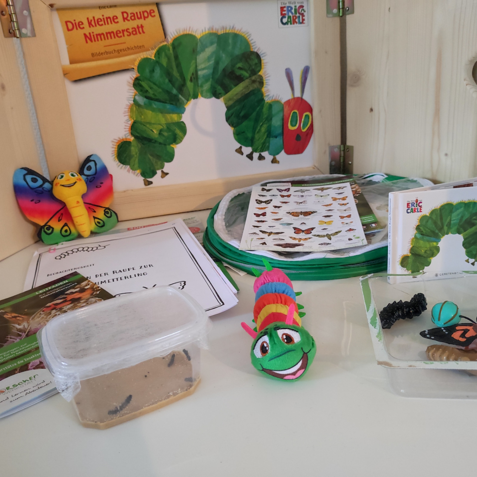 Auch basteln wir jetzt passend zum Thema Raupe und Schmetterling. Wir haben auch bücher passend beim Bücherei ausgesucht und lese ich oft die hungrige Raupe Nimmersatt vor.