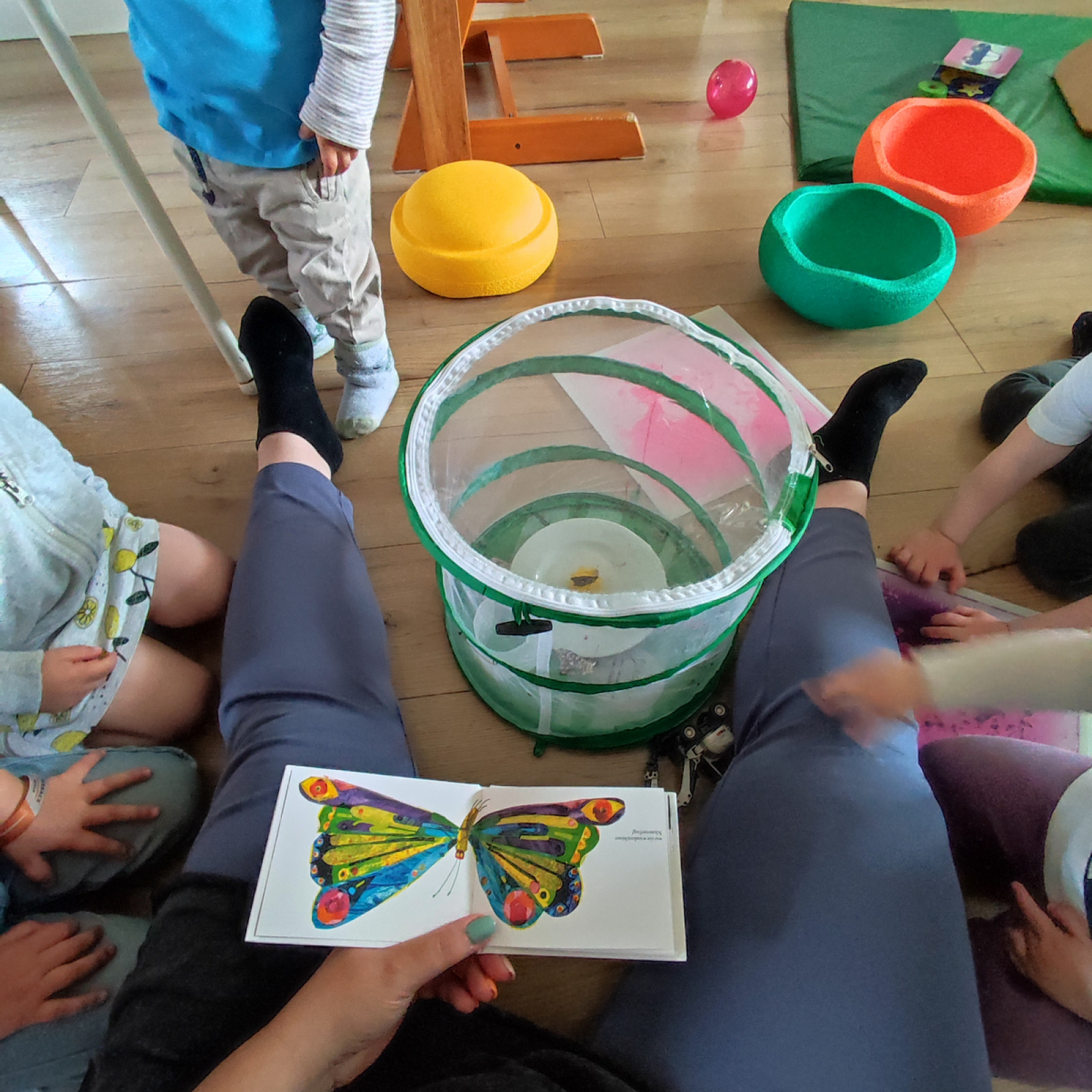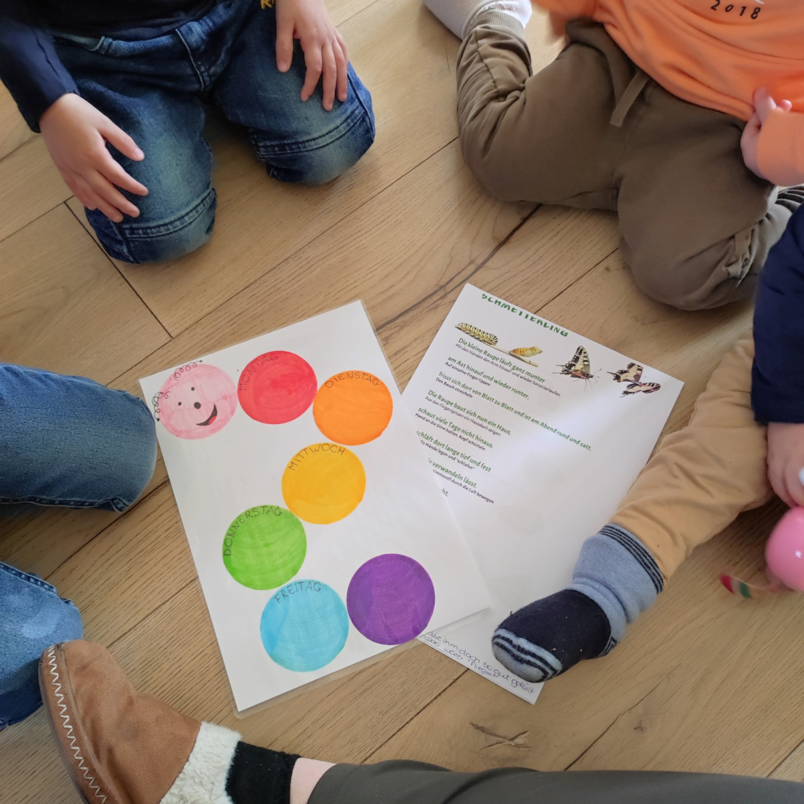 Und, fast vergessen, im Morgenkreis machen wir ein Fingerspiel von Raupe bis zum Schmetterling.