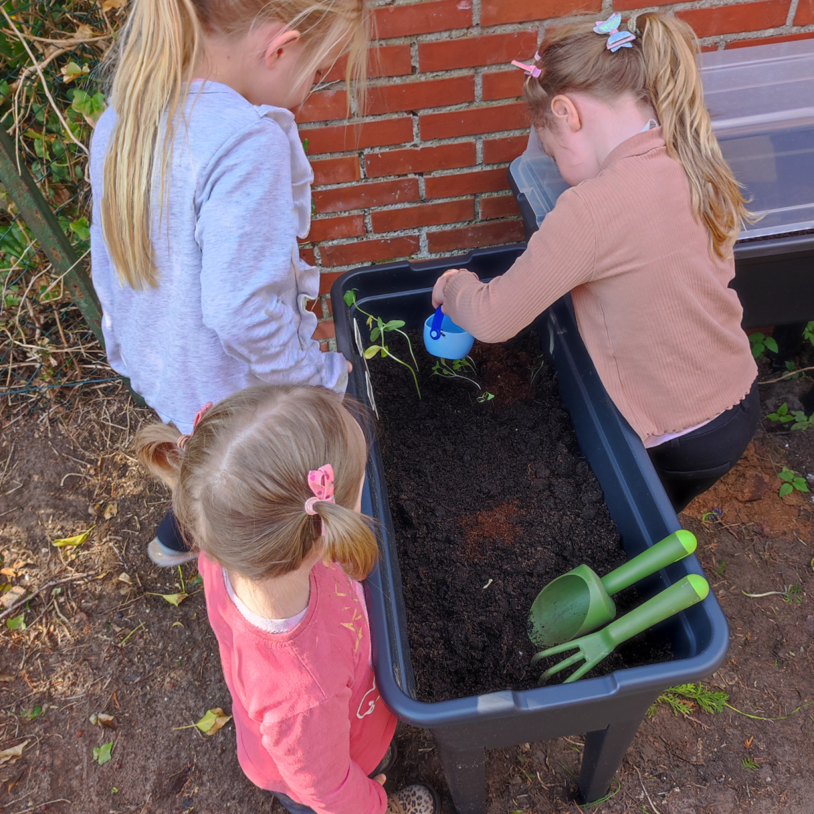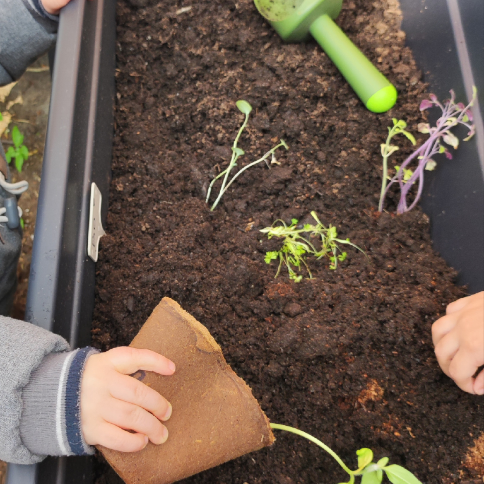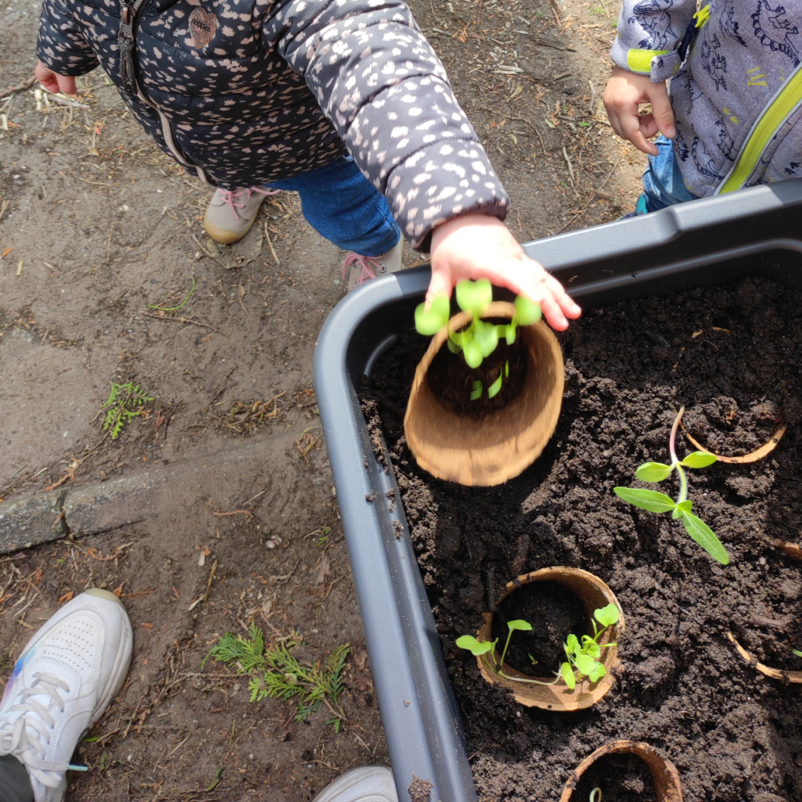 Die Kinder haben, mit ein bisschen hilfe, ihr gemüse und Sonnenblumen nach draußen im Hochbeet gepflanzt. Die Pflanzen waren schon ordentlich gewachsen und hoffentlich wachsen sie jetzt schön weiter.