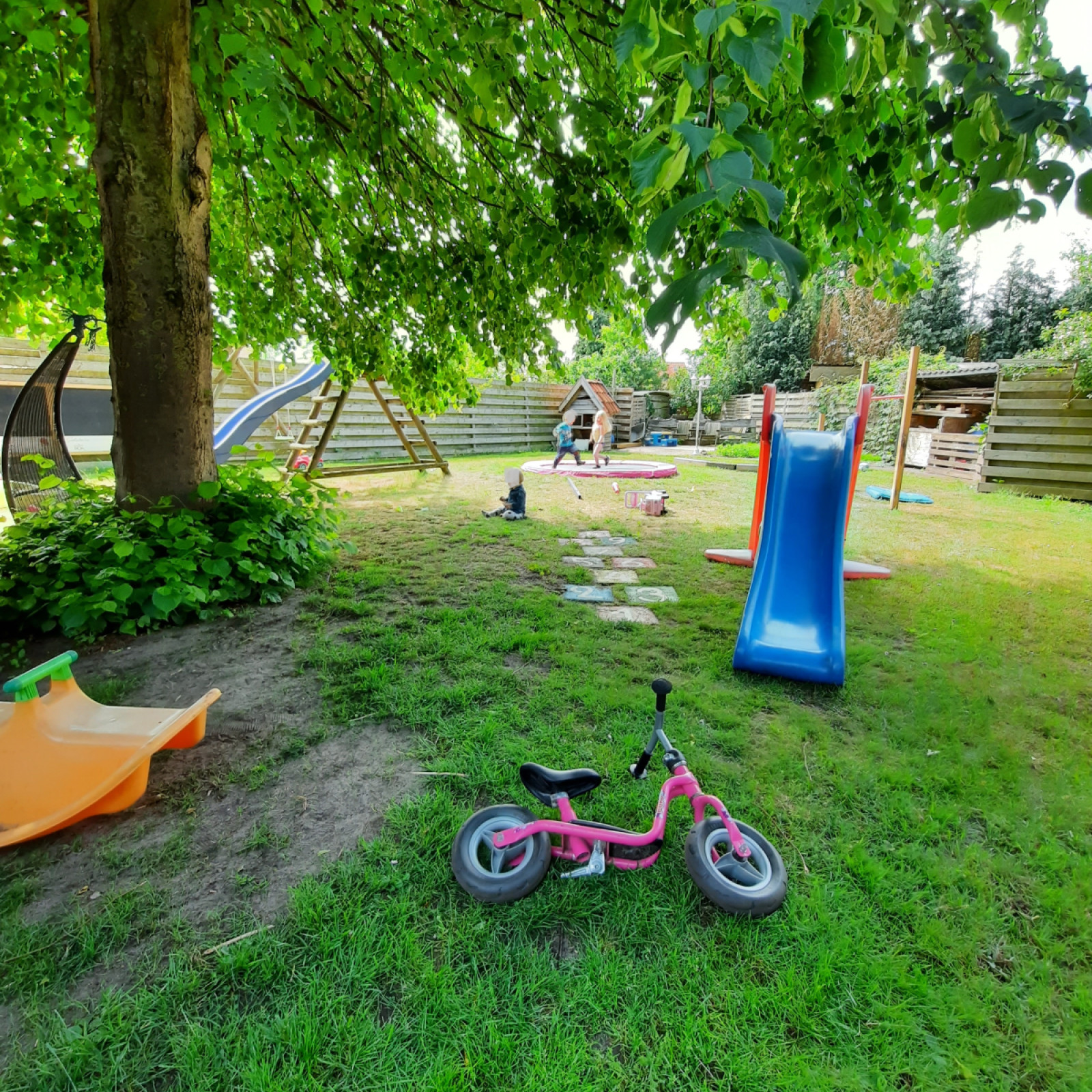 Direkt ans Haus grenzt ein großer Garten (700 m²), den wir gerne nutzen. Hier finden Sie eine Schaukel, eine groß und etwas kleinere Rutsche, ein großer Sandkasten, zwei Holpferde, ein eingegrabenes Trampolin, ein Spielhaus und Fahrzeuge (Bobby Car, Roller, Laufrad und vieles mehr).